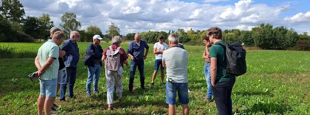 Na de uitwisseling en nieuw opgedane kennis bezochten de deelnemers één van de percelen van Hans Janssen. Dat perceel werd dit jaar pas ingezaaid en enkele weken geleden gemaaid. In het veld werd besproken hoe het perceel was bewerkt, welk mengsel werd gebruikt en wat het resultaat tot dan toe was. Hans was enthousiast over de productie van het mengsel afgelopen seizoen, ondanks de droogte. Er was een mooi aandeel van klaver en kruiden.